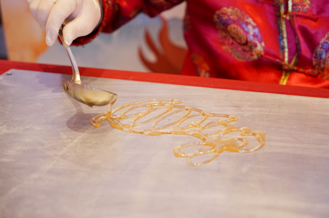 只见李部师傅气定神闲,右手执勺,左手扶板,铜勺微倾,琥珀色的糖浆如游丝般倾泻而下。勺尖与石板间游走出流畅的线条——或腾龙、或骏马、或牡丹、或锦鲤,糖液凝固不过数十秒,师傅腕转指扬间,趁热粘上竹签,轻轻铲起,一件件晶莹剔透、形神兼备的糖画作品便跃然眼前。炉火温润,糖香四溢,围观宾客屏息凝神,孩童们更是踮脚翘首,目不转睛。